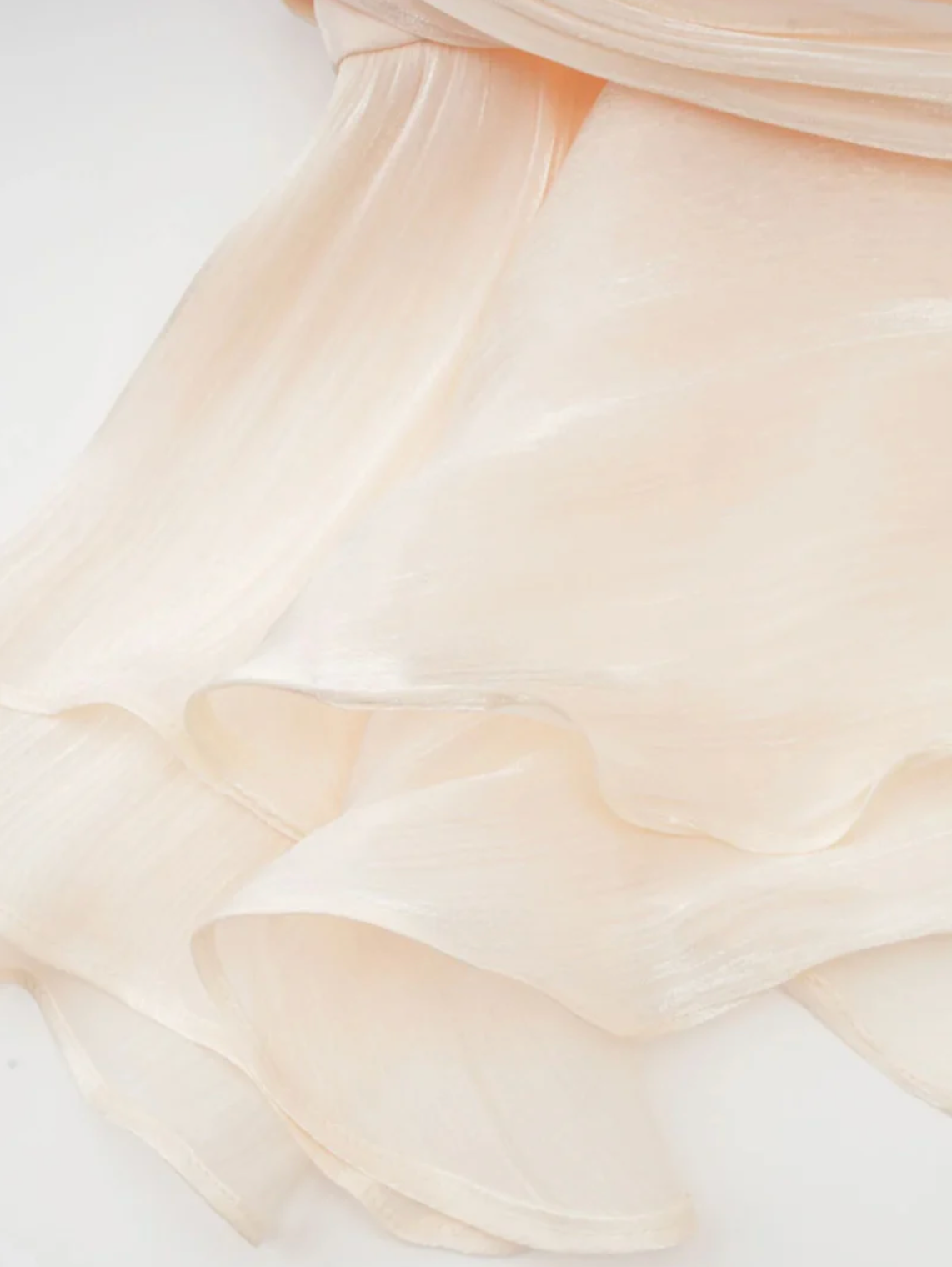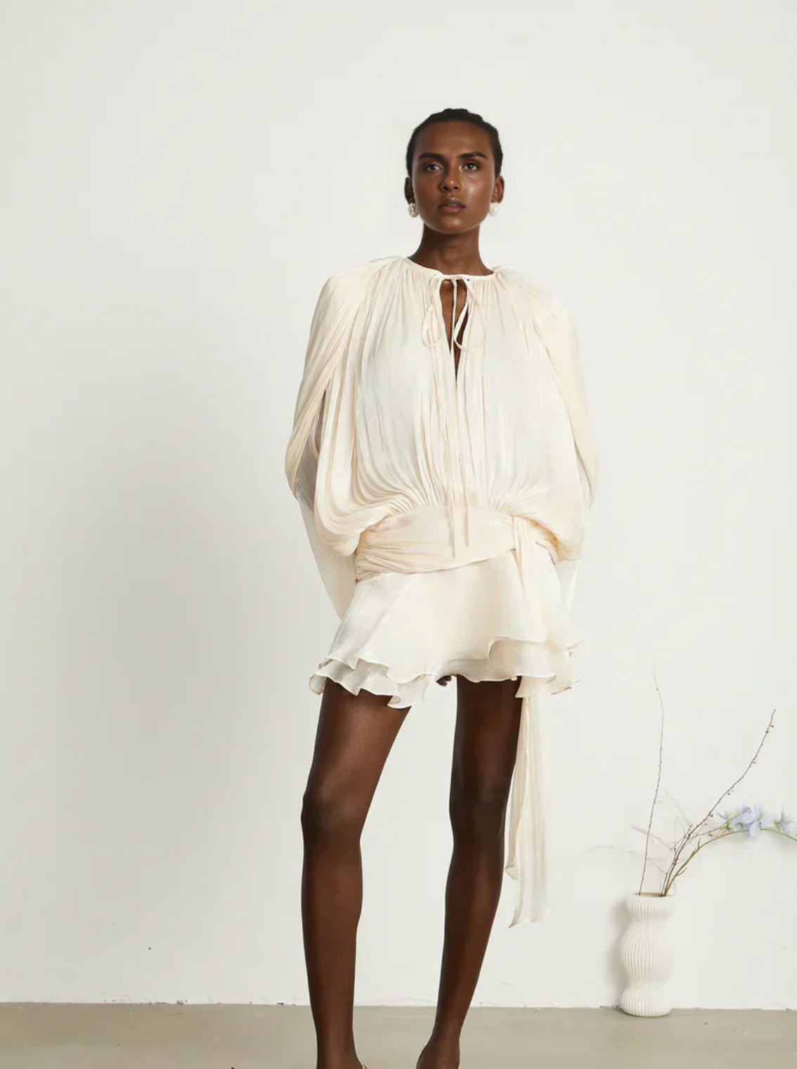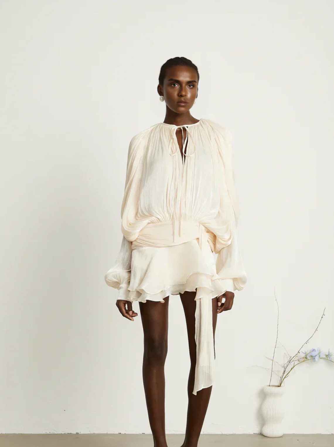 Ethereal charm and graceful sophistication – this soft ivory mini dress captures the essence of effortless femininity. Designed from a silky, lightweight fabric that flows beautifully with every movement, it features gently puffed balloon sleeves and delicate pleating for a romantic silhouette. The defined waistband highlights your figure, while the tiered mini skirt with soft ruffles adds a touch of playful elegance. For added comfort and ease, the dress includes a coordinating slip.