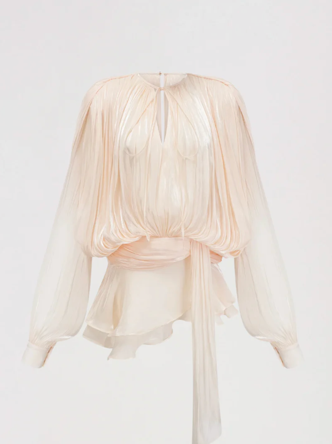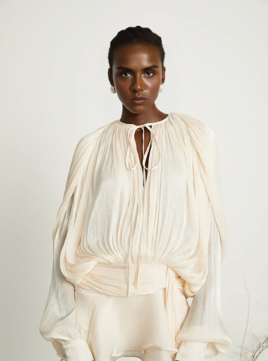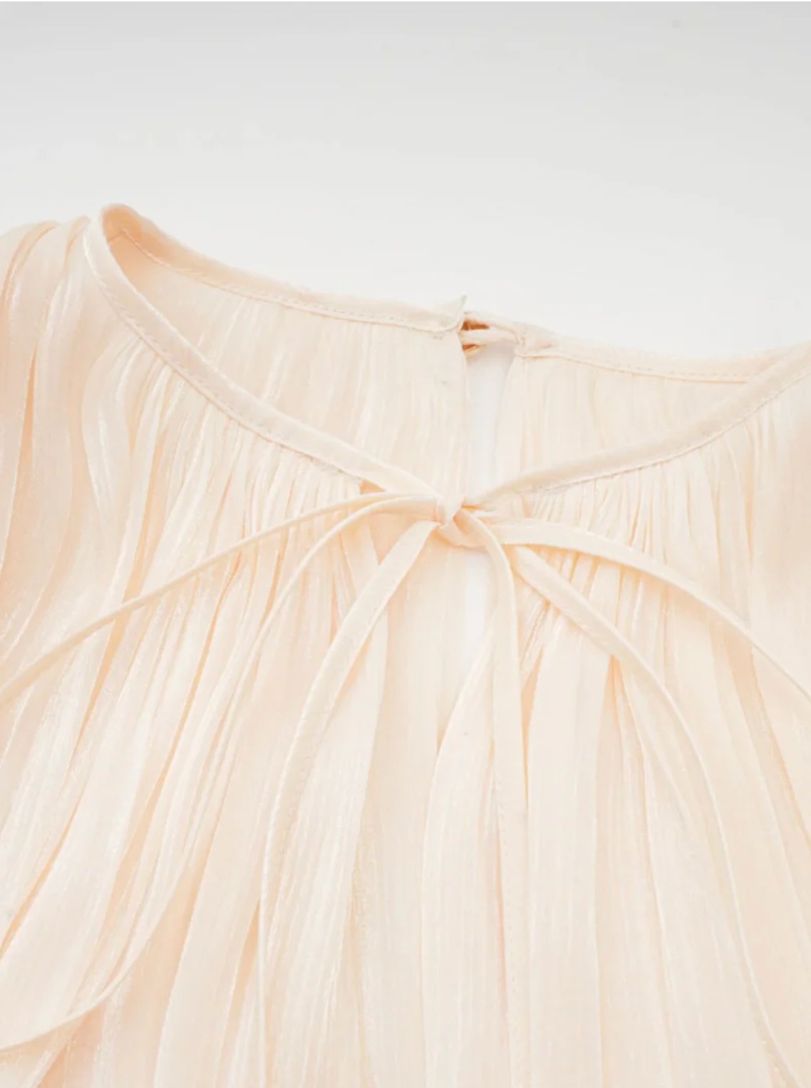 Ethereal charm and graceful sophistication – this soft ivory mini dress captures the essence of effortless femininity. Designed from a silky, lightweight fabric that flows beautifully with every movement, it features gently puffed balloon sleeves and delicate pleating for a romantic silhouette. The defined waistband highlights your figure, while the tiered mini skirt with soft ruffles adds a touch of playful elegance. For added comfort and ease, the dress includes a coordinating slip.