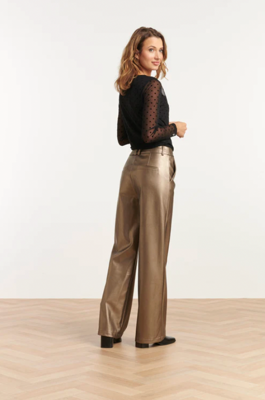 Crafted from fine mesh fabric, the top features an all-over flocked velvet dot pattern that adds texture and depth while maintaining a lightweight, sheer finish. The elegant V-neckline and long fitted sleeves create a flattering silhouette, while the softly draped mesh offers comfort and effortless movement. Perfect for layering over a bralette or cami, this top transitions seamlessly from polished daytime looks to elevated evening ensembles.