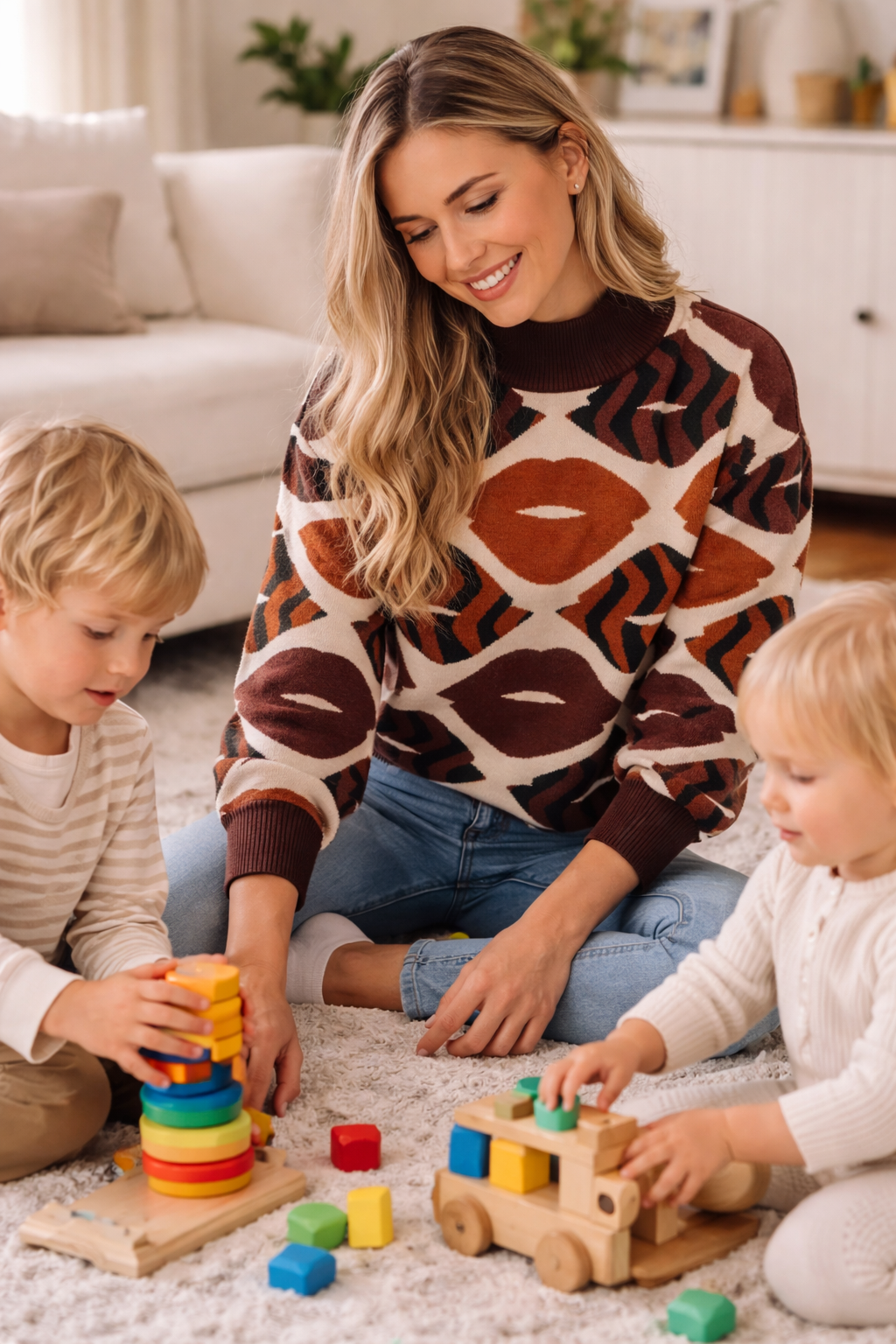 Featuring an eye-catching all-over lip-inspired pattern in rich brown, cognac, and cream tones, this jumper creates depth and character while remaining effortlessly wearable. The relaxed silhouette, long sleeves, and softly structured high neckline offer a refined yet comfortable fit, perfect for everyday styling. The harmonious colour palette adds warmth and versatility, allowing easy pairing with denim, tailored trousers, or skirts.