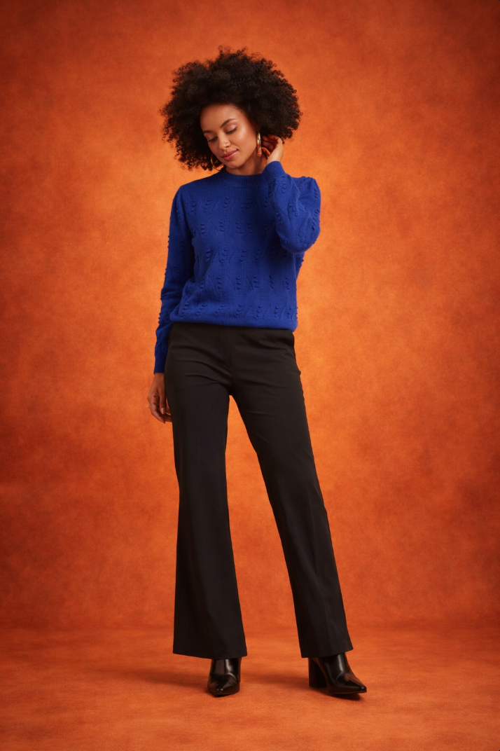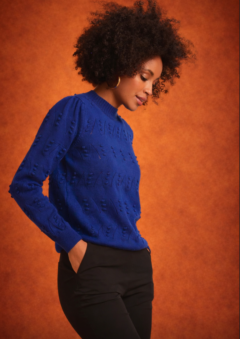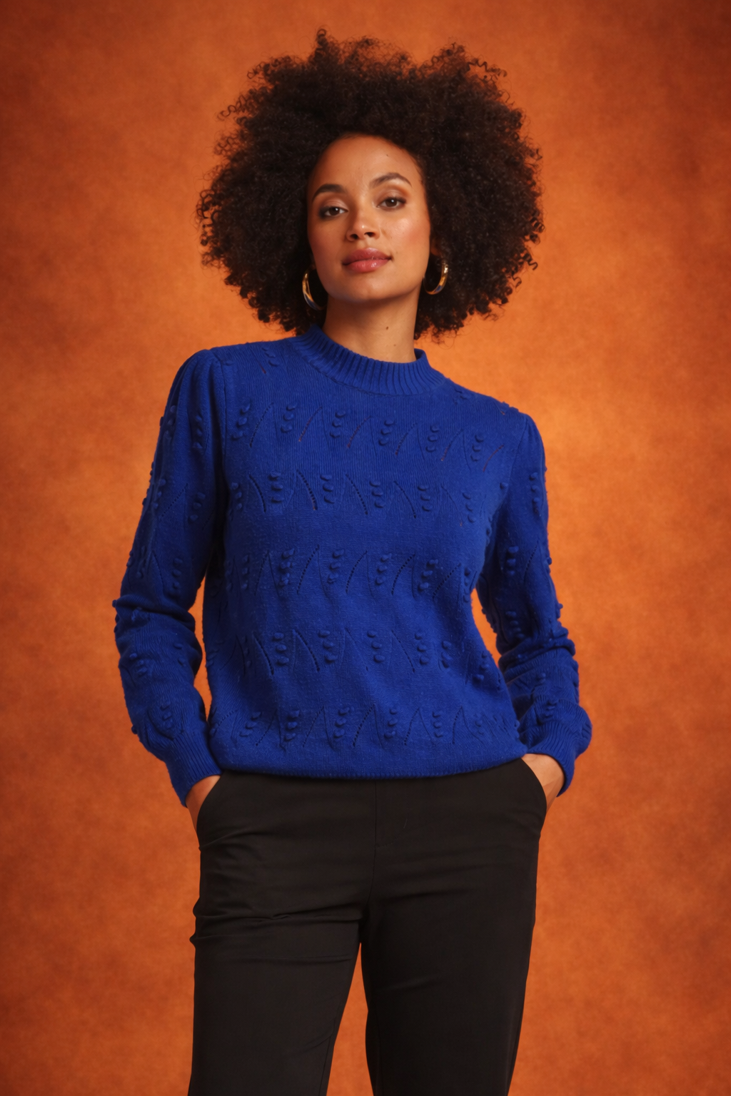 Rendered in a striking cobalt blue, this piece features an all-over raised bobble texture that adds depth and visual interest without overwhelming the silhouette. The classic round neckline and clean lines create a polished look, while the soft knitted fabric offers warmth, comfort, and breathability. Effortlessly versatile, this jumper transitions seamlessly from workwear to relaxed weekend styling.